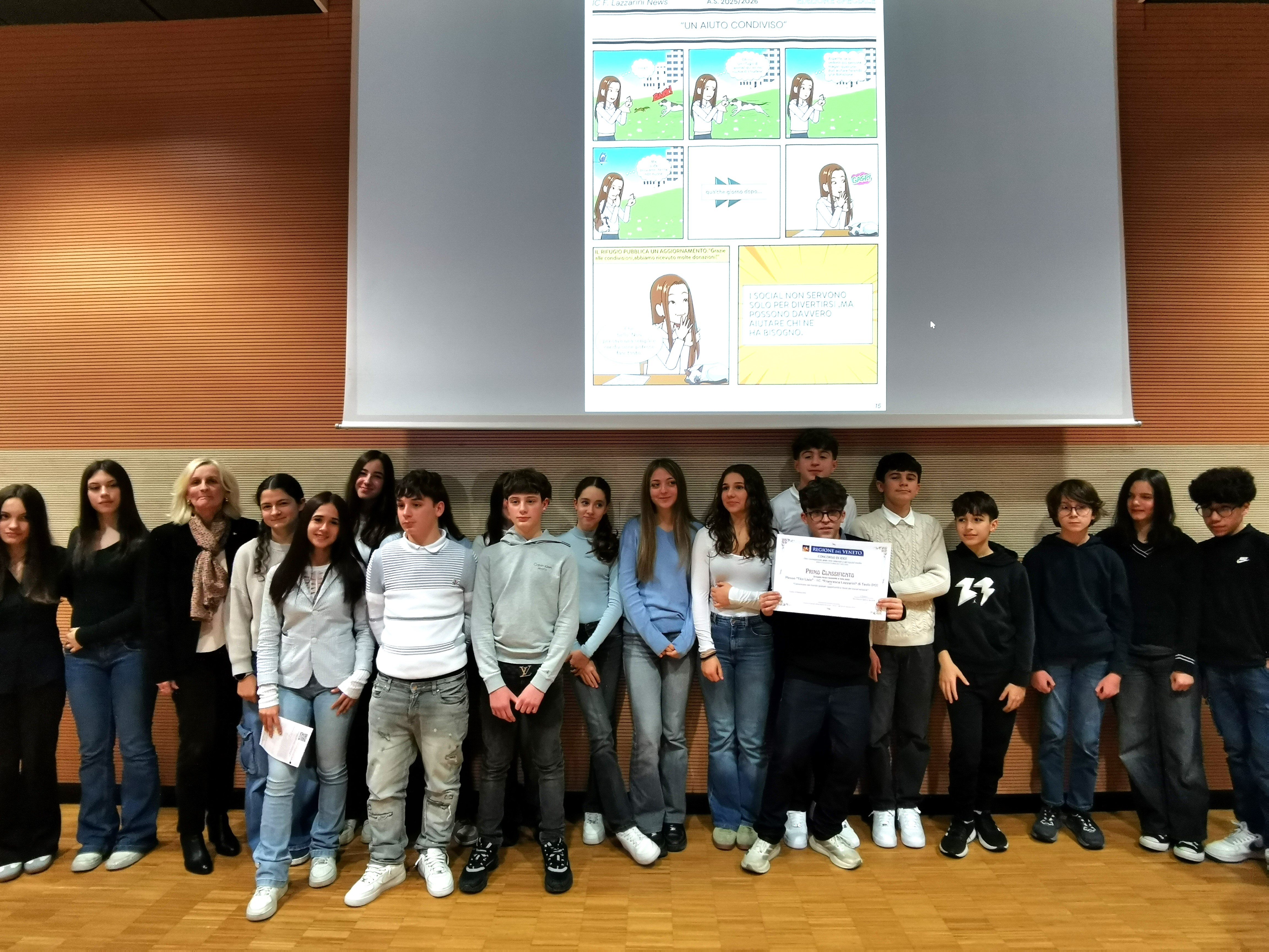 A seguire, in merito al tema “Buone pratiche sull’utilizzo del digitale”, gli studenti dell’ITC Calvi di Padova hanno presentato le attività promosse in ambito scolastico per Educazione Civica: la “Prevenzione al bullismo e al cyberbullismo” e il progetto di Peer Education, oltre al racconto sintetico di una storia tratta dall’opuscolo “Online senza rischi”.